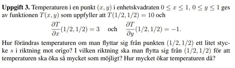 Sen tänker jag att man får riktningen för maximal temperaturökning med gradienten i punkten, som här är given (3,-1). Och jag tror man får ökningen om man tar beloppet av denna?