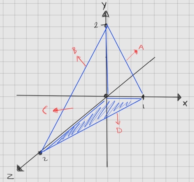 Triangel B A och D är parallella med ett av koordinatplanen, de är enkla att undersöka. Sätt den aktuella koordinaten till noll, dvs undersök tex f(x, 0, z) på triangeln D.