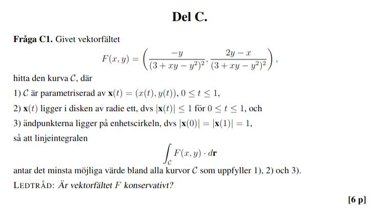 Ja, vänta, det var inget, kan man radera en tråd? Självfallet kan kurvintegralen ju anta ett negativt värde och det blir ju naturligtvis minimum. Läser jag facit igen så ser jag att det just var ett negativt värde de kom fram till. Smått pinsamt från min sida, sorry!