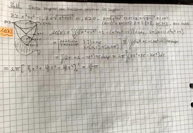 Är typ helt säker på att det är för att jag räknat med volymen under xy-planet, testade att räkna ut den snabbt och fick den till pi/2, drar jag av den från 16pi/3 får jag rätt svar. Så min fråga är framförallt hur jag kan justera i min räkning här nedan för att inte räkna med volymen under xy-planet?