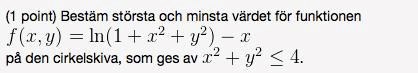Det jag har förstått hittills är att randen ges av x2+y2=4 och funktionen på denne är ln(5)-x. Hur ska jag gå vidare för att kunna hitta största och minsta värde?