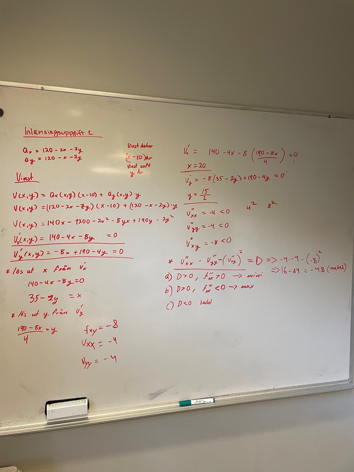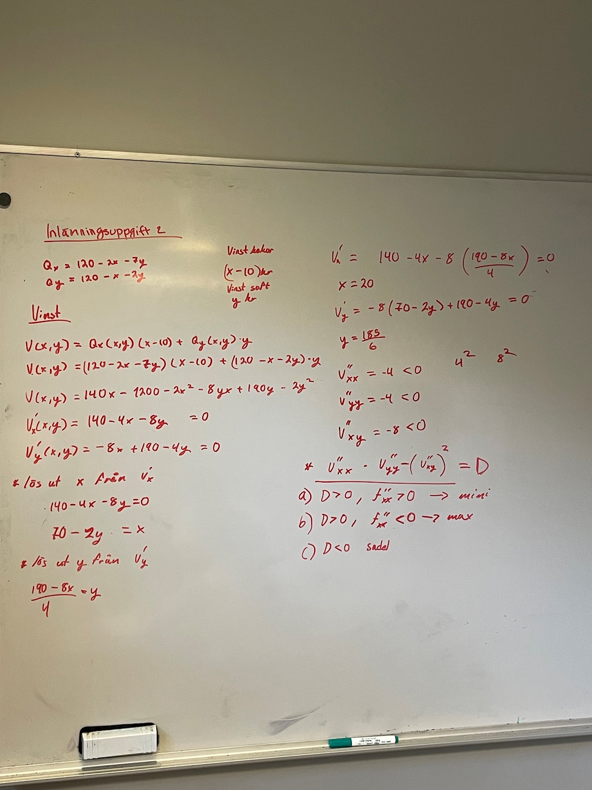 Skriv hennes vinst som en funktion av de båda priserna x och y. Vilka priser maximerar