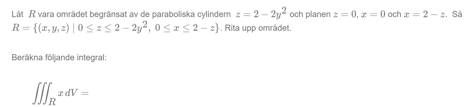 Vi har att 0 ≤ z ≤ 2-2y^2 och 0 ≤ x ≤ 2-z.