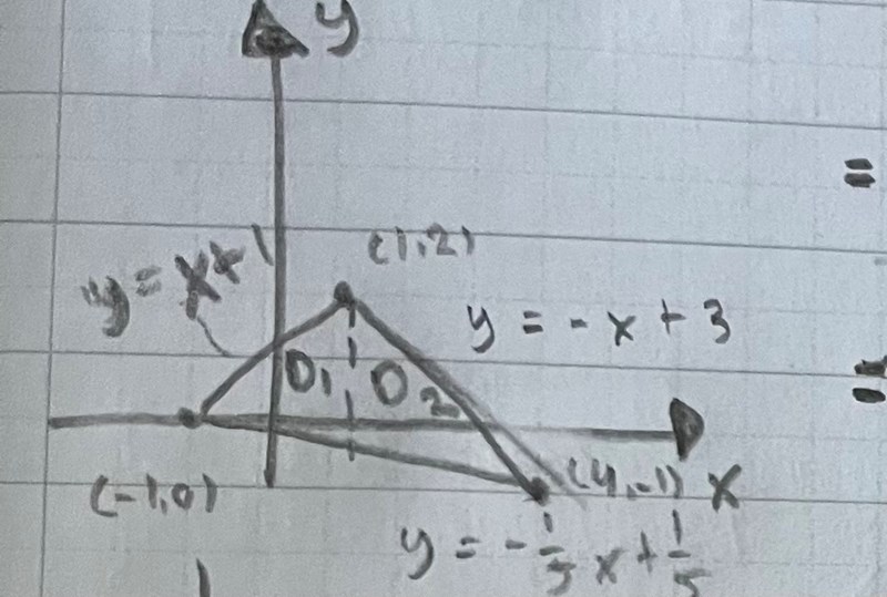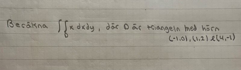 Hej jag har fastnat på denna fråga där jag ska lösa en dubbelintegral med triangeln (-1,0), (1,2) och (4,-1). Jag förstår hur jag får fram ekvationerna på varje sida av triangeln men sen när jag väl ska ställa upp dubbelintegralen förstår jag inte. Måste jag dela upp triangeln och göra två integraler?