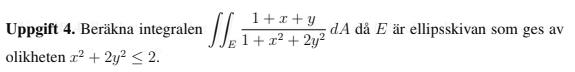 Jag väljer att gå över till polära koordinater och eftersom E är en ellipsskiva räknar jag ut skalfaktorn för den som blir . Alltså . Givet att: