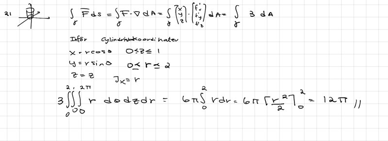 Du har glömt att dra bort locket och botten. Divergenssatsen gäller för slutna ytor (och lite andra villkor som är uppfyllda här). Du har alltså räknat flödet ut ur hela cylinderkroppen inklusive lock och botten. Om du räknar ut flödet (uppåt) för locket och flödet (nedåt) genom botten, och slutligen drar av det från totala flödet så kommer det att lösa sig.