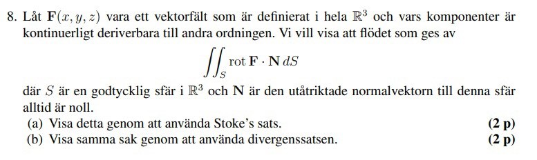 Jag har en undring gällande del a). Jag är medveten om lösningsapproachen att dela in sfären i 2 halvsfärer där man kan beräkna flödet ur halvsfärerna med stokes sats och likställa dem med kurvintegraler. Eftersom man betraktar flöden som går utåt i sfären kommer kurvintegralerna att ta ut varandra, då de båda har motsatta orienteringar längs kurvan av halvsfärerna.