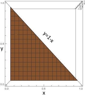 , där R är det bruna triangelområdet i ovanstående figur. Med insatta gränser i dubbelintegralen , landar vi i det uttryck du själv räknat fram.