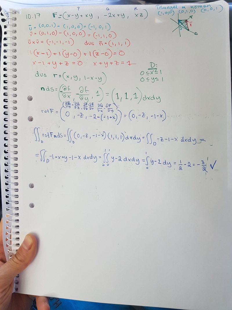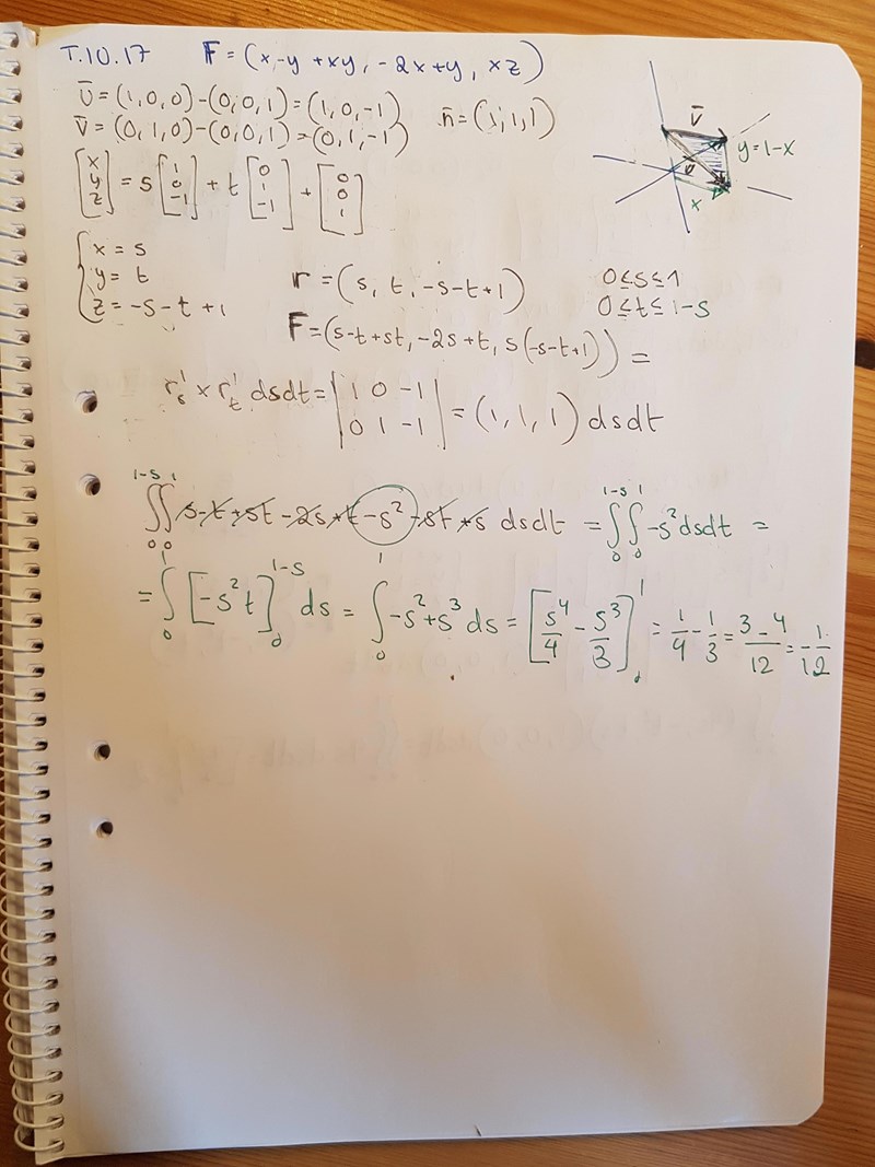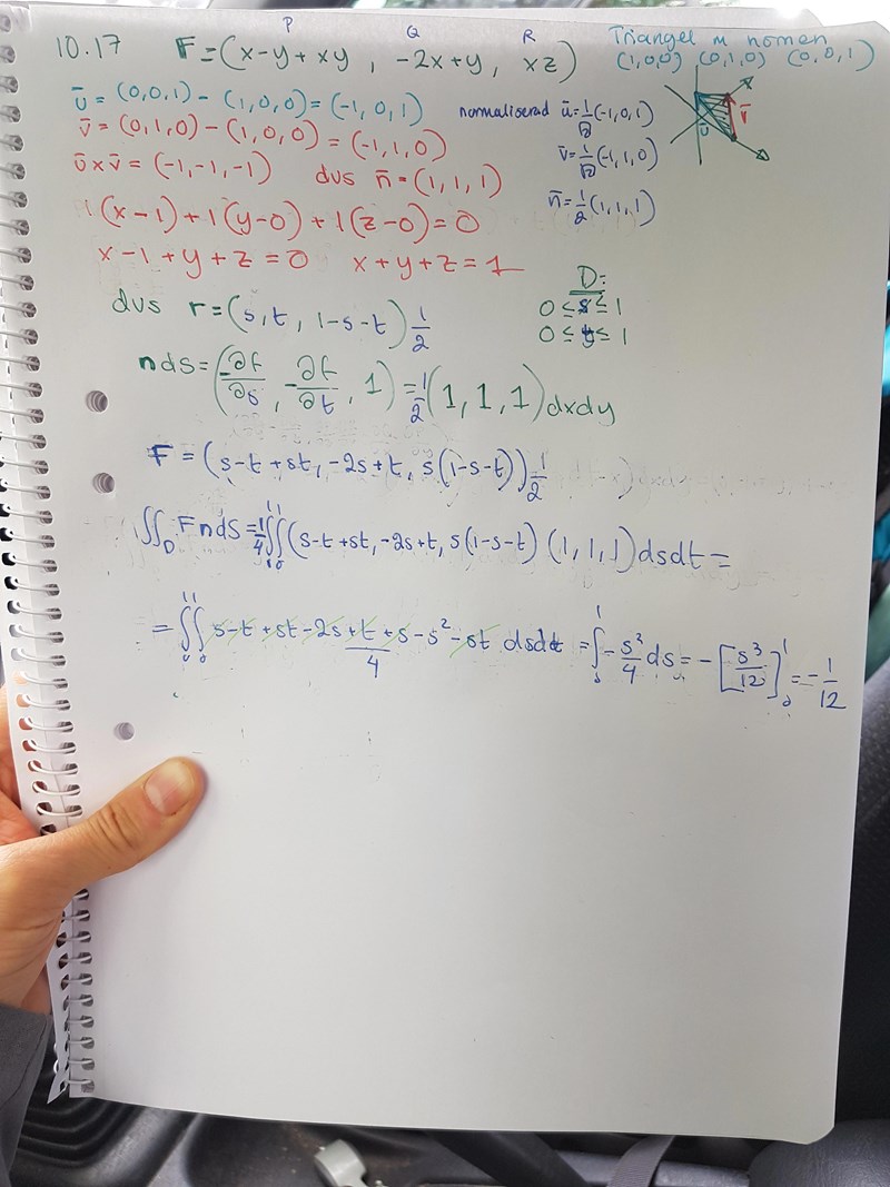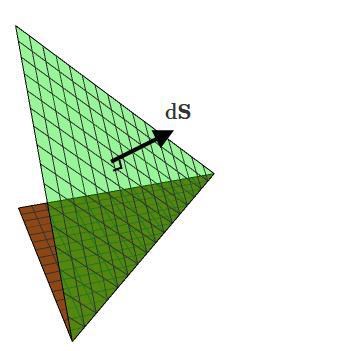 Ett annat, kanske enklare, alternativ är följande: I ovanstående figur har (enkel kalkyl) det grönrutiga planet, kallat S, ekvationen x+y+z-1=0, vilken är en nivåyta G(x,y,z)=0. Härav: Ytelementet , enhetsnormalen utåtriktad.