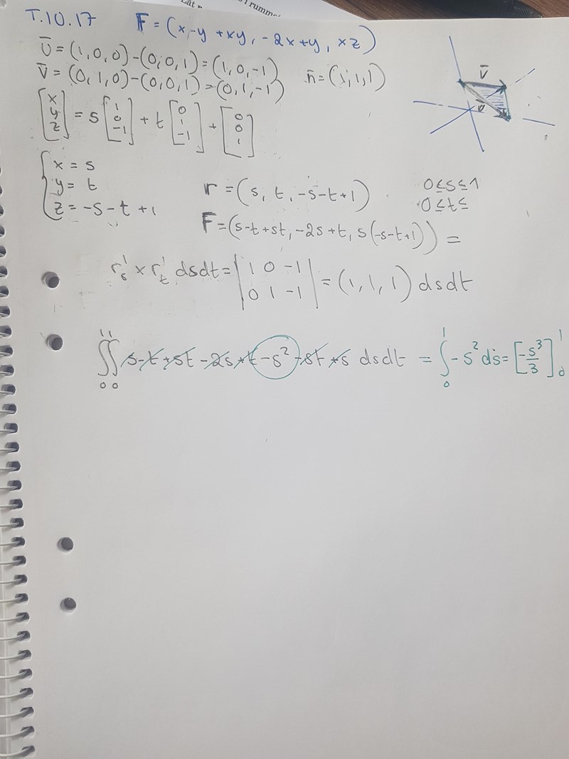 Jag tycker att du ska parametrisera den gröna triangelytan över den bruna triangelformade bottenytan D (se bild nedan) så här