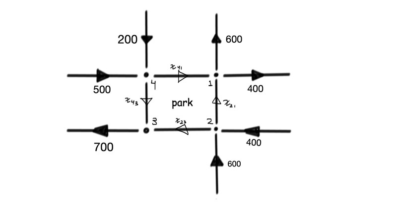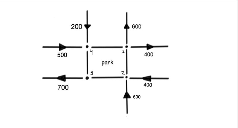 I figuren nedan visas ett nätverk som representerar biltrafiken i ett parkområde. Flödena på varje gren indikerar antalet bilar som passerar denna väg varje timme.