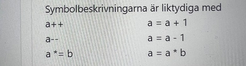 Förstår jag det rätt om a *=2 är detsamma som 2 = 2 * 1? Jag förstår inte om man ska ta med det i nästa steg, varför är det relevant med b - - då det är ett värde för a. Nej jag är helt vilsen kan någon snälla förklara