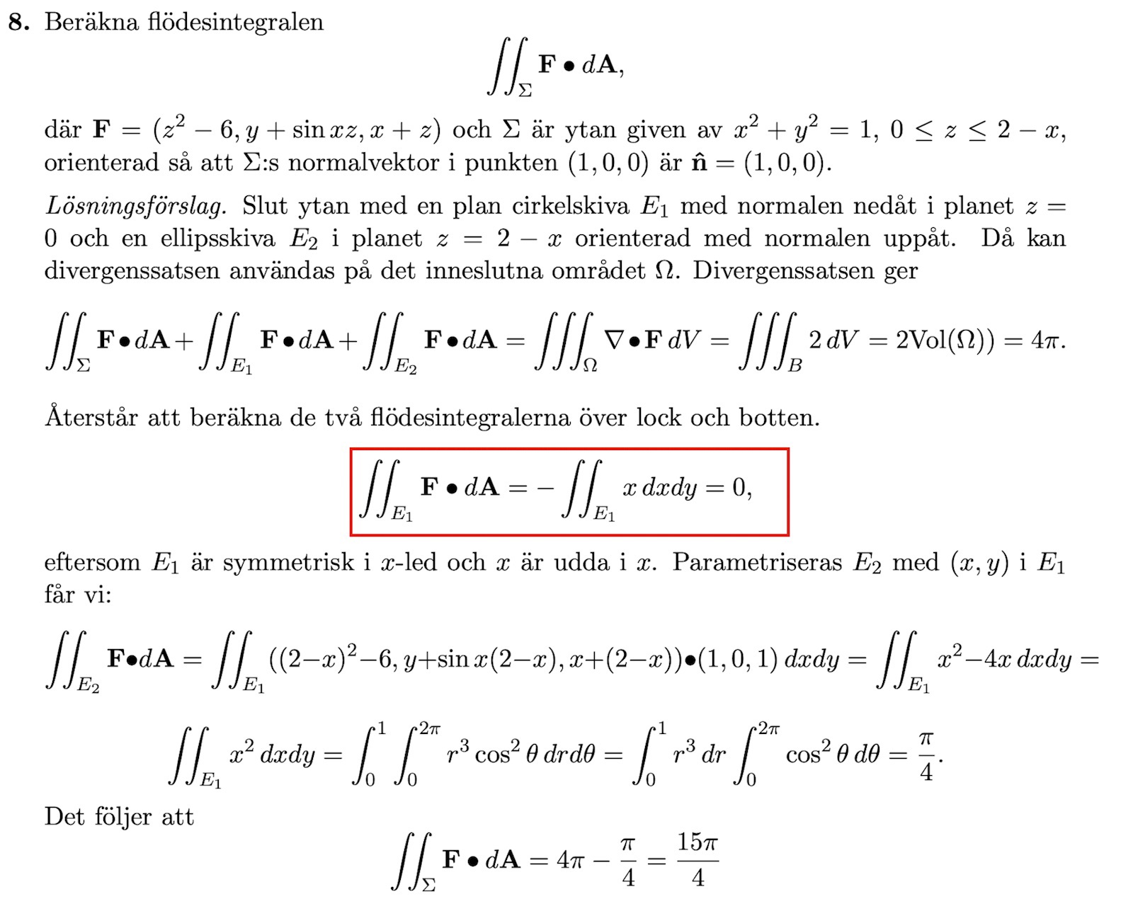 Jag förstår inte vad man har gjort där jag har markerat i rött. För E1 som är cirkelskivan i planet z=0 pekar ytans enhetsnormal neråt dvs (0,0,-1)? Om jag då antar att man har skalärmultiplicerat vektorfältet med enhetsnormalen blir det ju -1(x+z) men så är z=0 på ytan så det blir bara -x (är det så man ska tänka?).