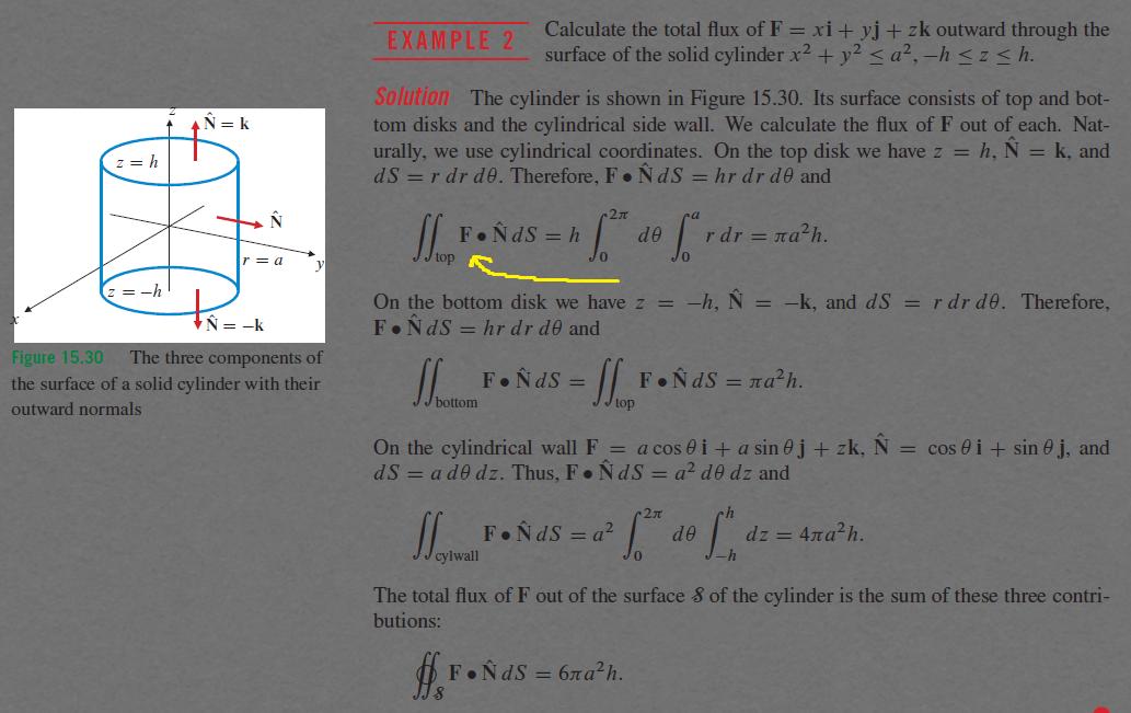 Försöker beräkna den övre delen av locket på cylindern, dvs då z=h. Får först att dS=k dxdyd \textbf S =k  dxdy men vad ska F\textbf F vara? Förstår inte riktigt förklaringen nedan