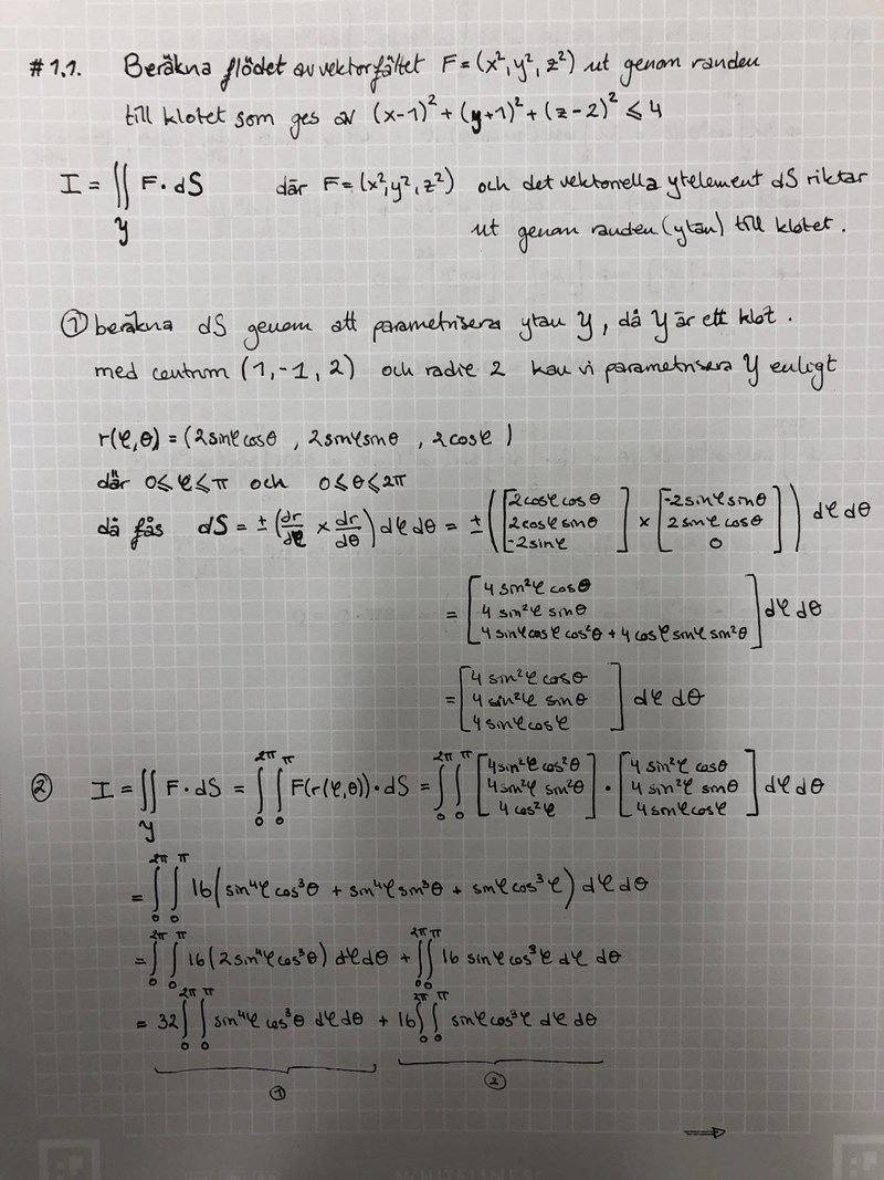 Vad jag undrar är hur jag ska parametrisera klotet, spelar det någon roll att det inte är centrerat i origo? om så är parametriseringen för x = 2cos(theta)sin(fi) + 1 ?