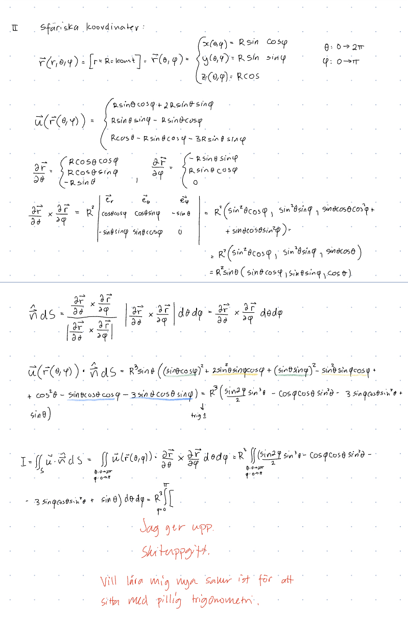 Kan du inte räkna ut divergensen av u i kartesiska koordinater och sedan då den är på den formen omvandla de resulterande koordinaterna till sfäriska och dV till vad dV blir i sfäriska koordinater?