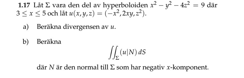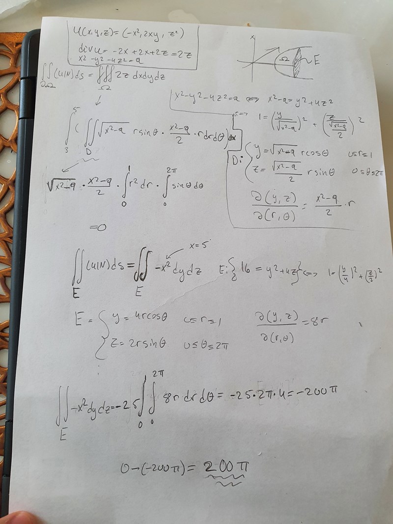 Divergensen får jag till 2z. Jag försöker sedan använda gauss sats för att ta reda på flödet över hela kroppen och sedan subtrahera flödet från ellipsen där x=5 men det blir inte riktigt rätt. Svaret enligt facit är 200*pi på b uppgiften.