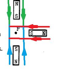 Som magneterna är placerade från början har fälten från de båda vertikala magneterna motsatt riktning i P så man kan dra slutsatsen att fältstyrkan på 21 mT kommer från magneten till höger.
