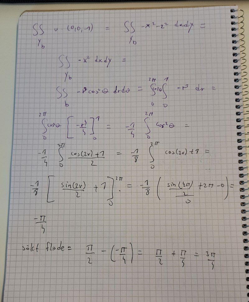 den där cirkelskivan förstår jag fortfarande inte var den kommer ifrån eller hur den är en del av en hela sfären ( får inte upp en bild i mitt huvud). Men vad synd att metoden med helsfär gör bara det jobbigare med beräkningar.  Sen tror jag inte att jag ser hur det blir jobbigt med beräkningar för det makeade mer sense när vi pratade om det. Totala flöde genom helsfär-flöde genom nedre sfär=flöde genom övre halvsfär.