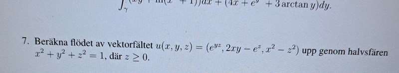 En sak jag tänkte på nu när jag läste frågan igen var att det står att man ska bestämma flödet "upp genom halvsfären". Det är lite dåligt formulerat men de kanske vill att man ska beräkna flödet genom ytan fast i z-riktningen (om vi forutsätter att z-axeln är riktad "upp").