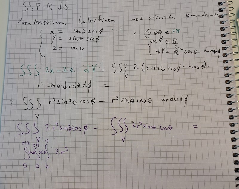 Ja precis vi ska ju dra bort nedre halvsfären  på slutet? Jag förstod det som att vi ska göra detta sist. Nu är fokuset att använda gaus sats för en helsfär och utför beräkningarna.