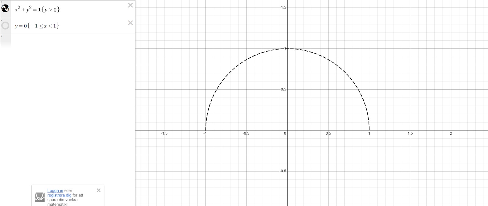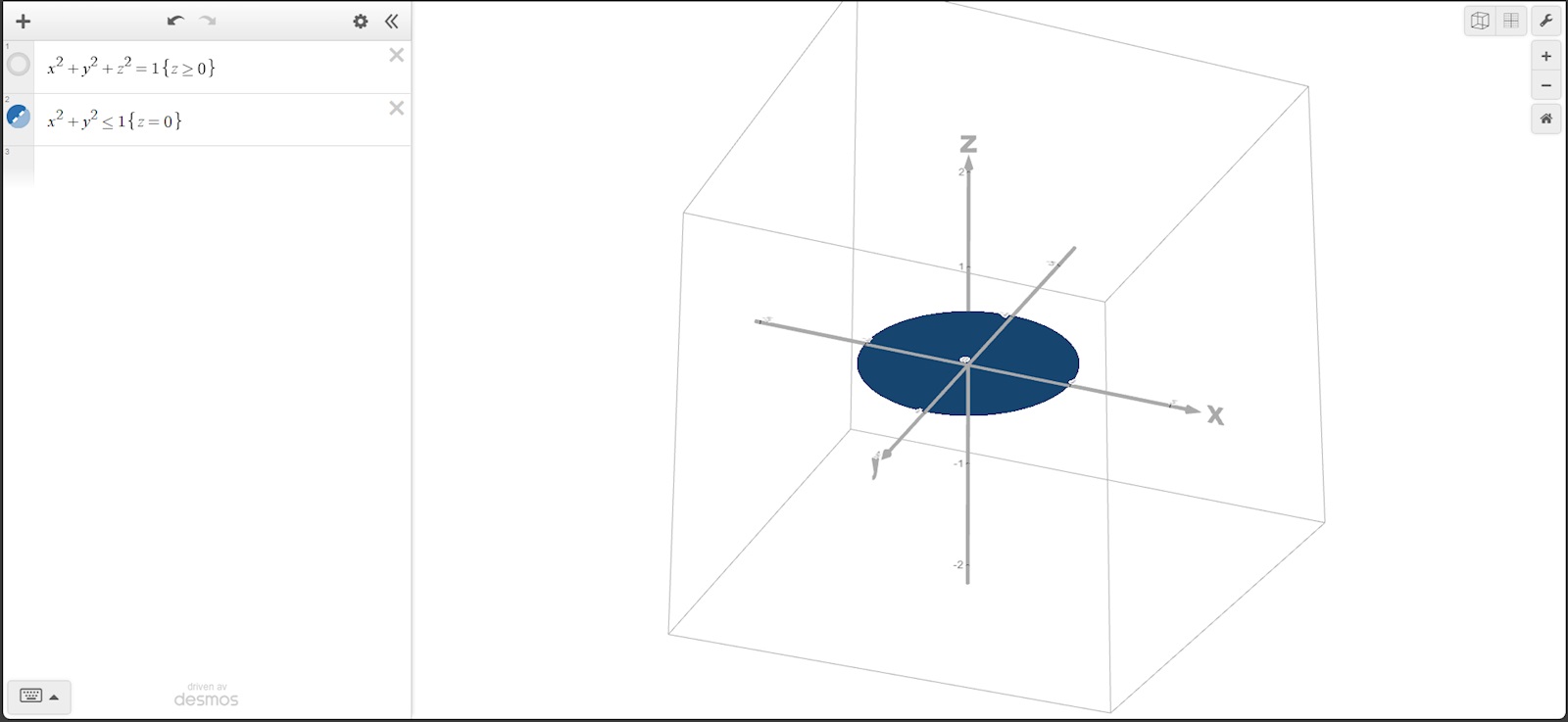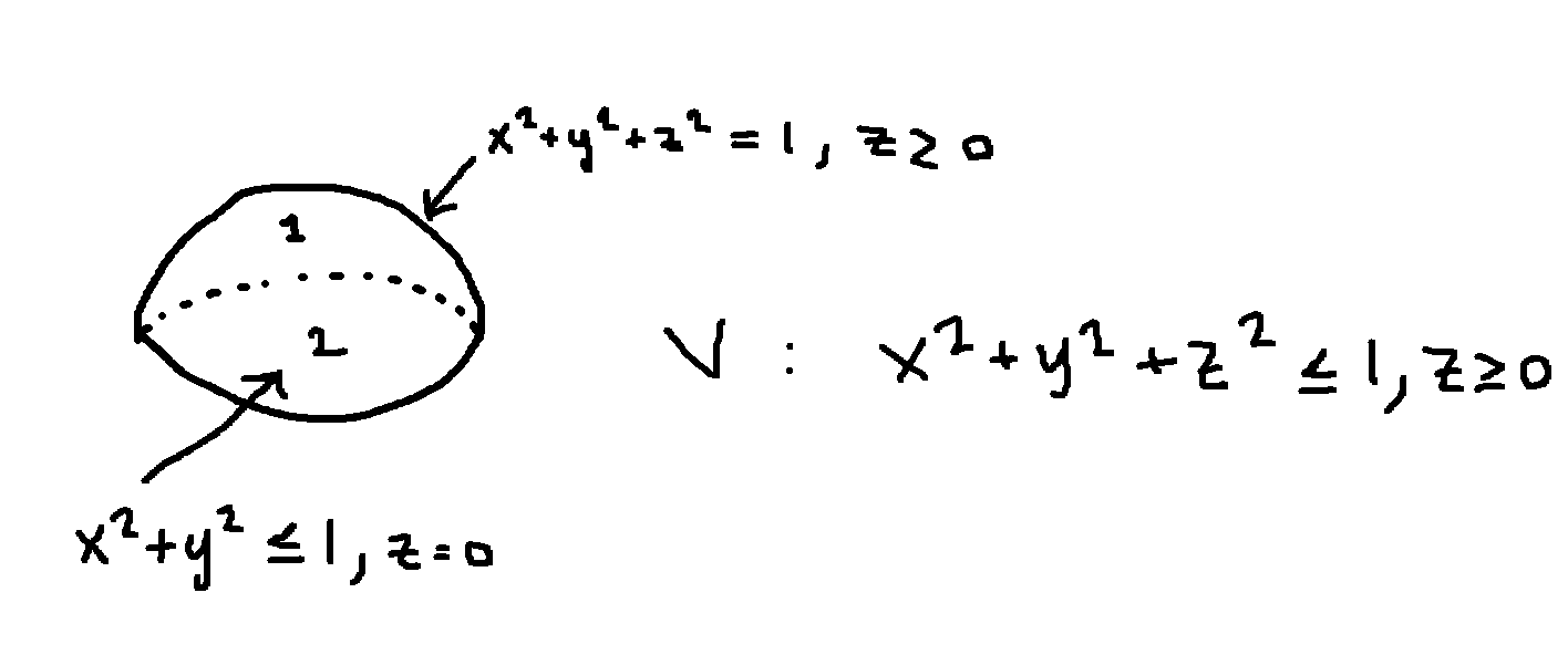 Du får låtsas att händerna är halvsfären och cirkelskivan. Gör en av händerna skålformade, den handen representerar halvsfären (x^2 + y^2 + z^2 = 1, z >= 0). Låt andra handen representera cirkelskivan (x^2 + y^2 <= 1, z = 0). Om du nu täcker för skål-handen med cirkelskiva-handen får du en sluten yta. Området som innesluts är x^2 + y^2 + z^2 <= 1, z >= 0.