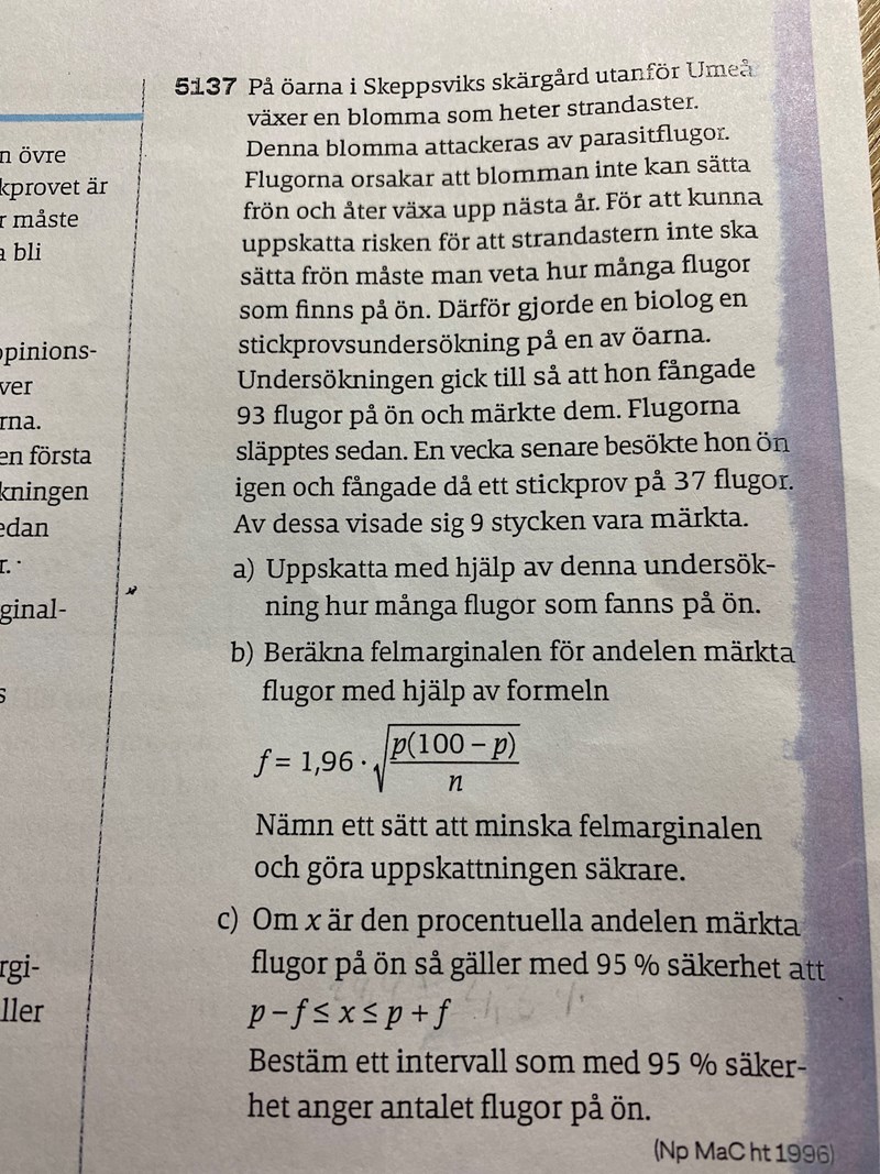 Kom fram till att andelen märkta flugor i procent var 24,4% och felmarginalen var ca.4,3.