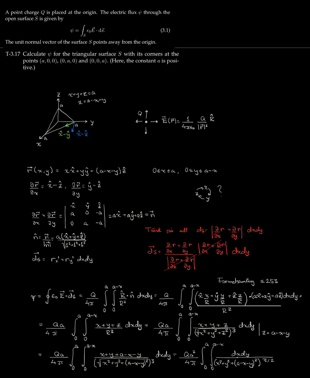 Förstår inte hur du kan lägga till en sfär i första oktanten. Denna sfär har en normal som är parallell med det elektriska fält i alla punkter (x,y,z). Till skillnad från x+y+z=a där normalen inte är parallell med det elektriska fältet (endast i några punkter är de parallella).