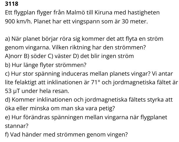 För när planet når sin marchhöjd uppkommer en inducerad spänning men inte ström eftersom hastigheten är konstant. Men sedan när flygplanet deaccellererar, då uppkommer en spänning åt andra hållet för elektronerna flyter åt andra hållet. Men teorin bakom det här förstår jag inte.....