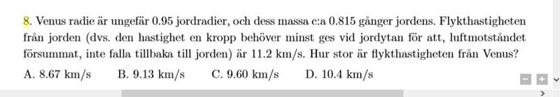 Du skriver att rörelseenergin lika med gravitationskraften, vilket förstås inte går. Rörelseenergin ska vara lika med skillnaden i potentiell energi GmM/r; eventuellt är det det du försökt räkna med i sista raden. Enklast är om du ställer upp ett förhållande mellan flykthastigheten på Venus respektive jorden.