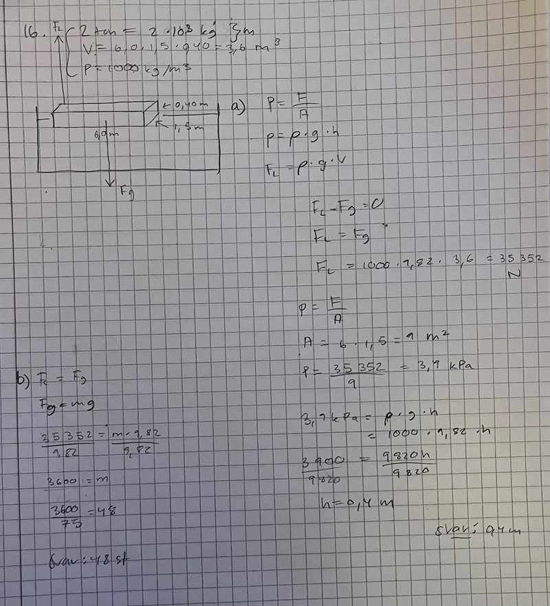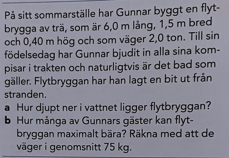 Jag håller på med a och b uppgiften som du kan se nedan. Nedan kan du även se hur jag har löst den (om något är otydligt är det bara att fråga). Som du kan se har jag ritat upp en bild där jag har ritat krafterna flytbryggab utsätts för. Jag får både fel svar i uppgift a och b (jag antar att jag får fel i b då jag fått fram fel värden i a som används till b uppgiften). Jag undrar vad i uträkningen jag gör som är fel? Jag tycker det jag gör känns logiskt, men jag kanske har missat nått steg?