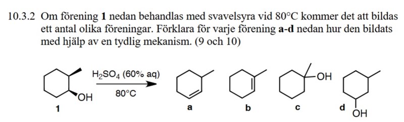 Jag tänker att en karbokatjon behöver bildas annars går det inte riktig. Har väl karbokatjonen bildas kan omlagringar som hydridskifte ske. Det gör att en tertiär karbokatjon kan bildas, till vilken vatten kan adderas och ge ämne c.
