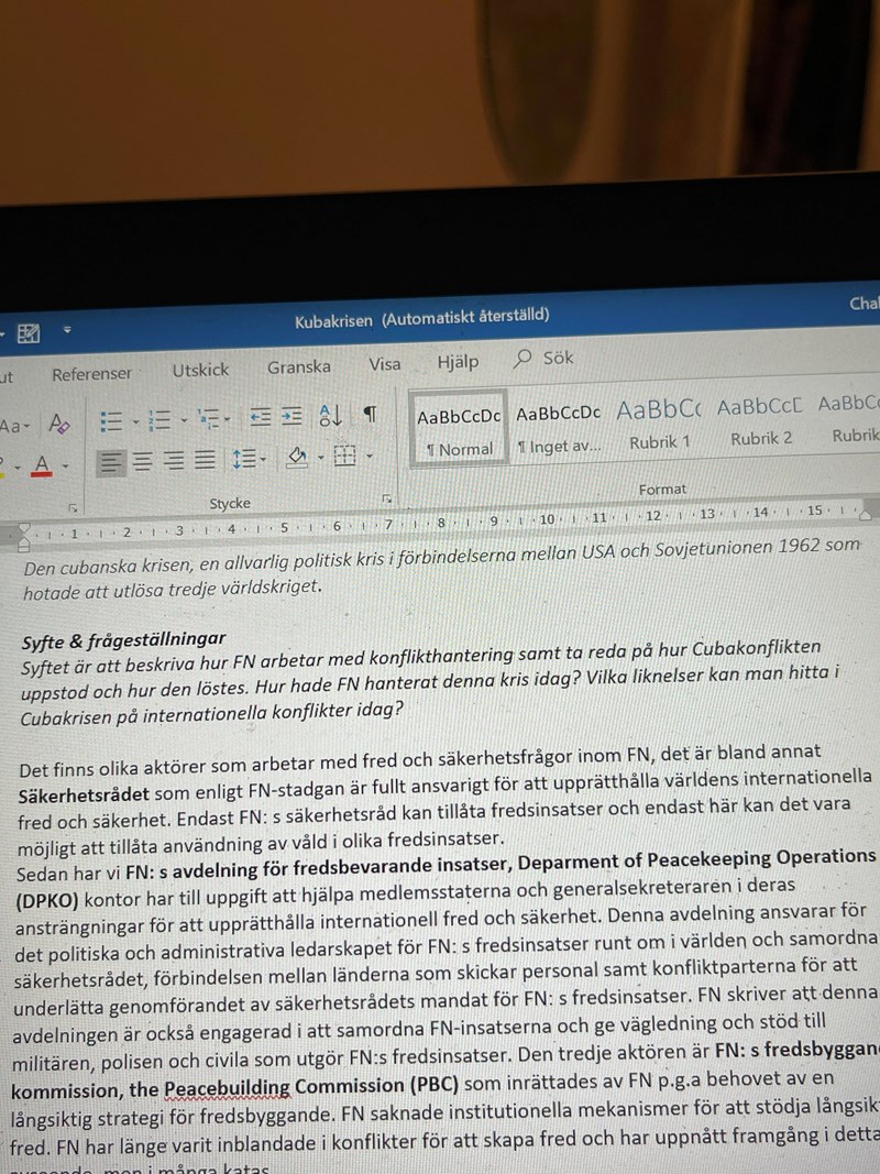 Jag skriver en text om FN konflikthantering alltså hur de hanterar konflikter. Och man ska utgå från olika frågor, jag har beskrivit hur de hanterar konflikter idag men jag har fastnat på just den frågan. Som ni ser jag har två frågeställningar. Och jag har skrivit det flesta med hur de hanterar konflikter. Men jag vet inte hur jag ska sätta ihop en lösning på hur de hade hanterat det idag