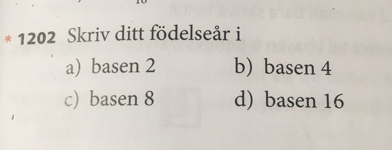 Om födelseåret till exempel är 1982 så ska du på a-uppgiften skriva i basen 2.