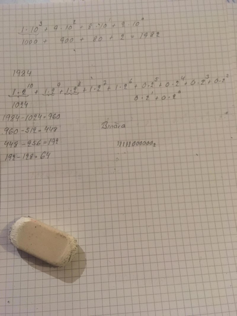Om vi ska få ihop 1984 kan vi se att vi behöver ta EN styck "1024", för tar vi fler blir det för mycket. Sen tittar vi hur mycket som återstår, 1984-1024=960. Då tittar vi hur många "256:or" vi kan plocka. Vi kan ta TRE stycken för 256*3=768 hade vi tagit fler så hade det blivit mer än 960. Vad återstår nu 960-768=192. Nu ser vi hur många "64:or" vi behöver. Vi kan ta TRE stycken 64 or som då blir 64*3=192. Oj, nu visade det sig att vi redan kommit upp i det vi skule för 192-192=0. Då behöver vi inte ta några av de sista valörerna utan kan sätta nollor där.