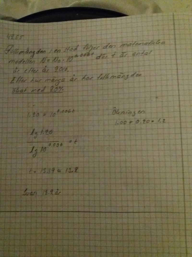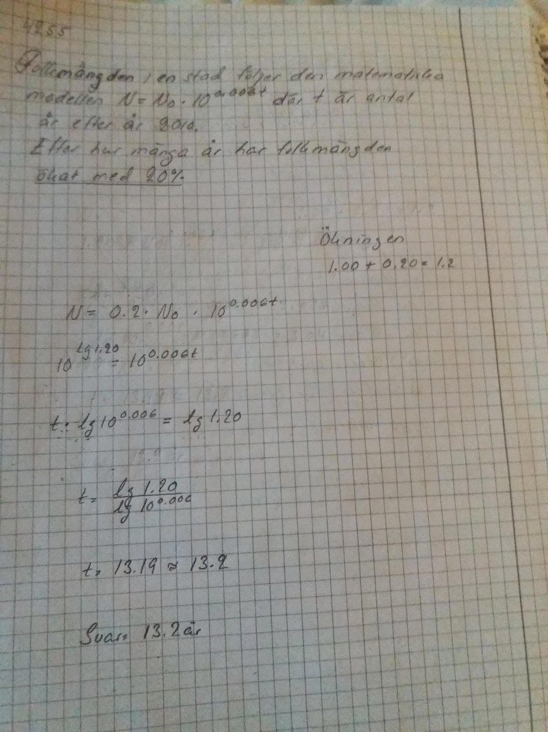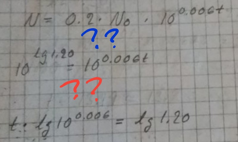 1. Det är inte tydligt hur du kommer från 1,2 = 10^(0,006t) till lg(1,2)/lg(10^0,006) = t