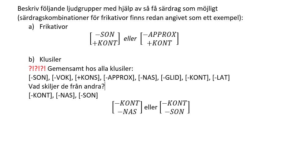 Eller kombinationer av särdrag som bara kan existera i (i detta fall) frikativor? - Detta känns jättesvårt och abstrakt att försöka finna ett slags mönster i tabellen. Vad är det jag bör titta efter?