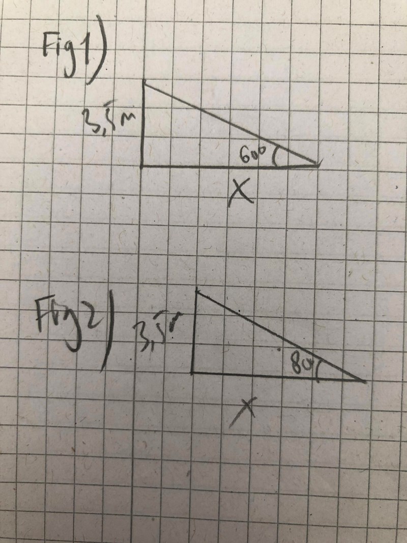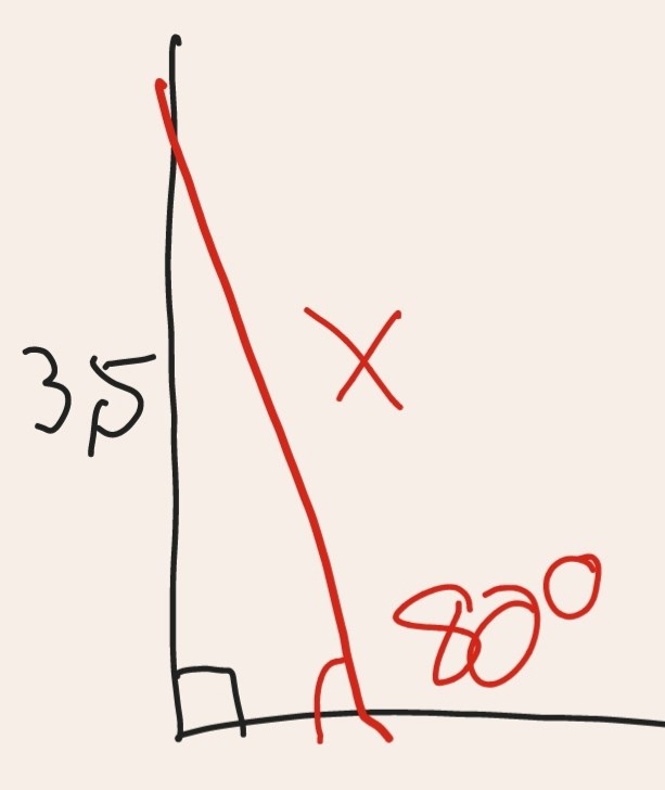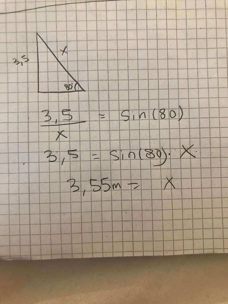 Sätt nu upp ett trigonometriskt samband mellan vinkeln 80°, sträckan 3,5 m och stegens längd x.
