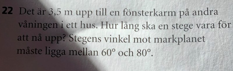 Om vi istället tolkar uppgiften som att vi ska bestämma hur lång stegen måste vara för att den ska kunna nå upp om vi själva får välja i vilken av de tillåtna vinklarna den ska stå så är svaret att den måste vara åtminstone (ungefär) 3,6 meter lång.