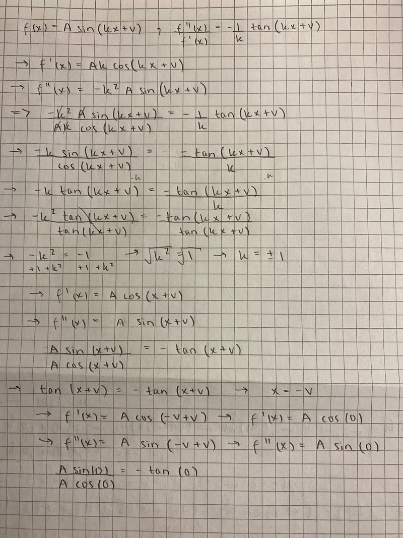 När jag tar fram första och andraderivatan för f(x) = A sin(x+v) (k=1) och sätter in den i formeln får jag som jag sedan förenklar till , förstår inte vad jag ska göra.