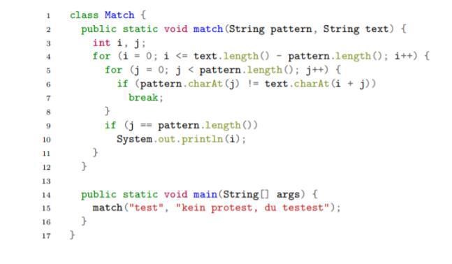 Så jag tänker mig att loopen skall fungera är då if(j== pattern.length()) blir sant dvs då j = 4 så skrivs i ut. Sen går den tillbaka till den yttersta for loopen, i =i+1 och sedan går den ner till den inre for loopen men eftersom j nu är 4 så kommer den inte köras(j är inte < pattern.length). Men tydligen så kommer den in i for loopen igen och j blir 0 och jag förstår inte hur.