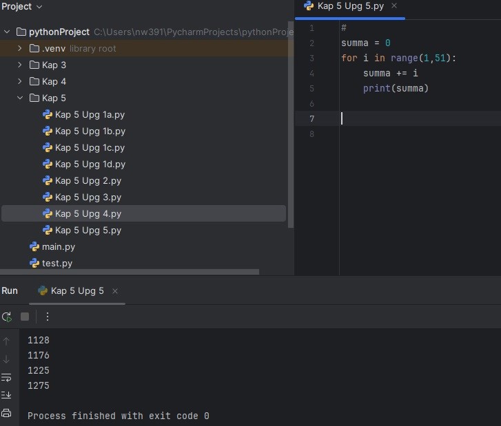 uppgiften: "skriv några programrader som beräknar summa av alla tal från och med 1 till och med 50"