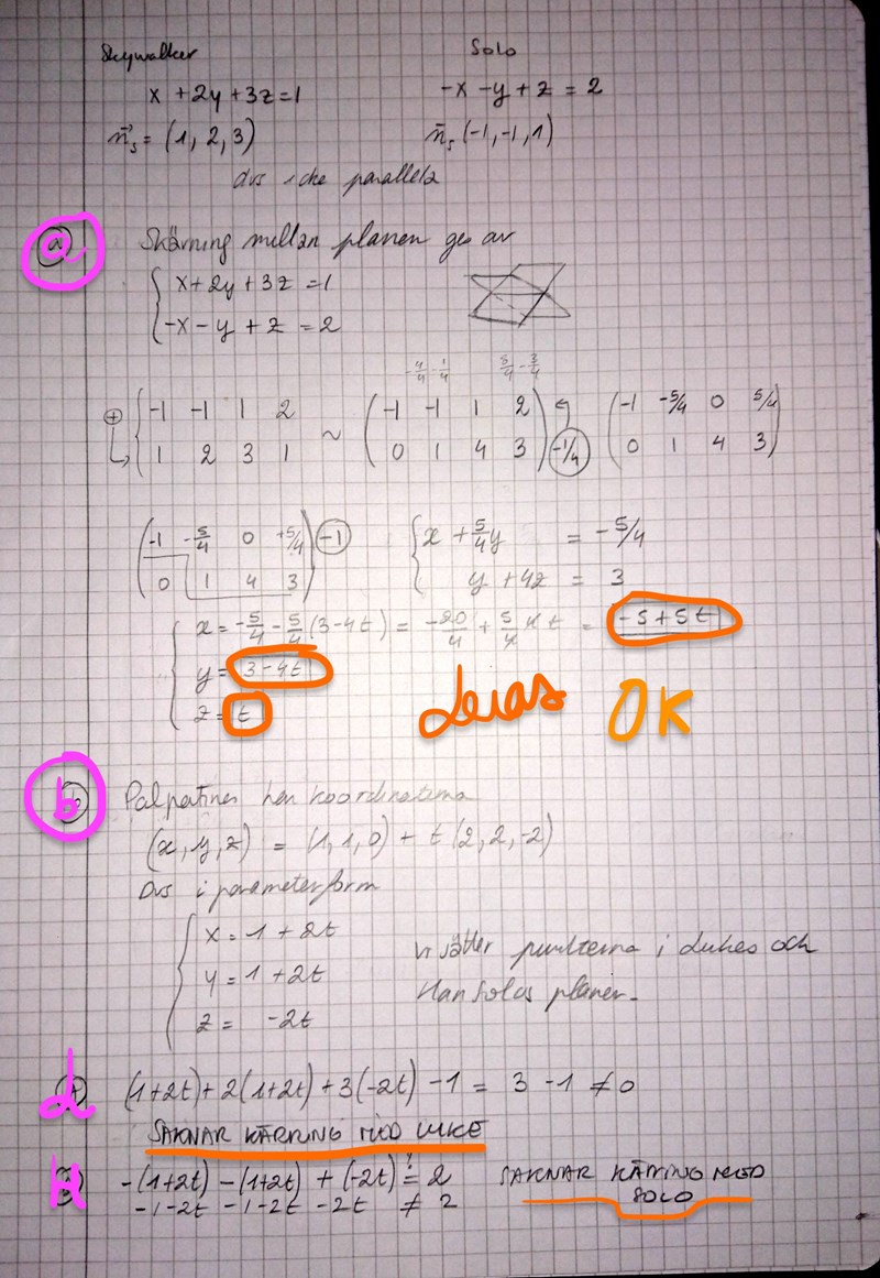 Du har kommit fram till att Solo skär planet när , dvs när .