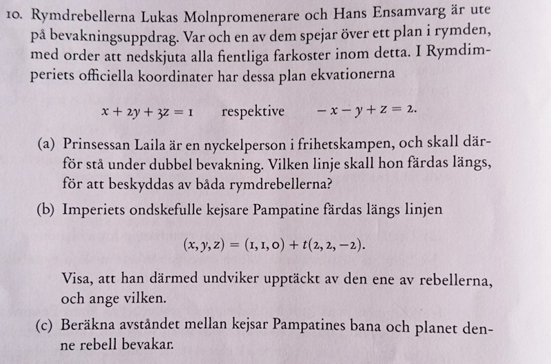 Leia är jätteviktig, och måste ha dubbel bevakning. Luke och Han vaktar båda varsitt plan. Där dessa plan skär varandra (vilket vi väl får utgå ifrån, eftersom Leia annars dör), kommer det att finnas en linje av rummet som bevakas av både Han och Luke. Din uppgift är att hitta denna linje, och det är viktigt att det blir rätt. Känn ingen press, men frihetskampen hänger på dig! ;)