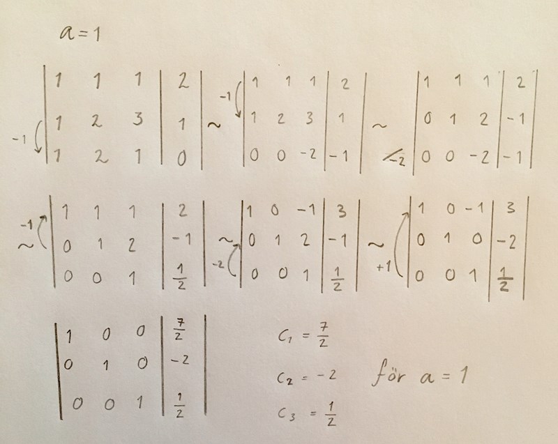 Skulle du möjligen vilja visa hur det skulle bli i lösningsvektorn? Jag är inte så van vid att dra bort en multipel av något av en rad från en annan rad. Det blir så lätt fel.