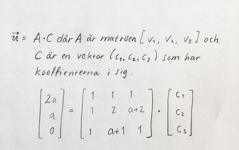 För vilka a är vektorerna (1,1,1), (1,2,a+1) och (1,a+2,1) linjärt oberoende? Då bildar de en bas i rummet. Bestäm koordinaterna för vektorn u = (2a,a,0) i denna bas?