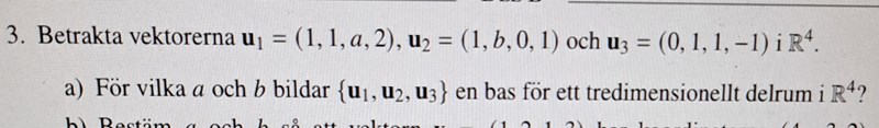 För vilka a och b bildar {u1,u2,u3} en bas i R^4?