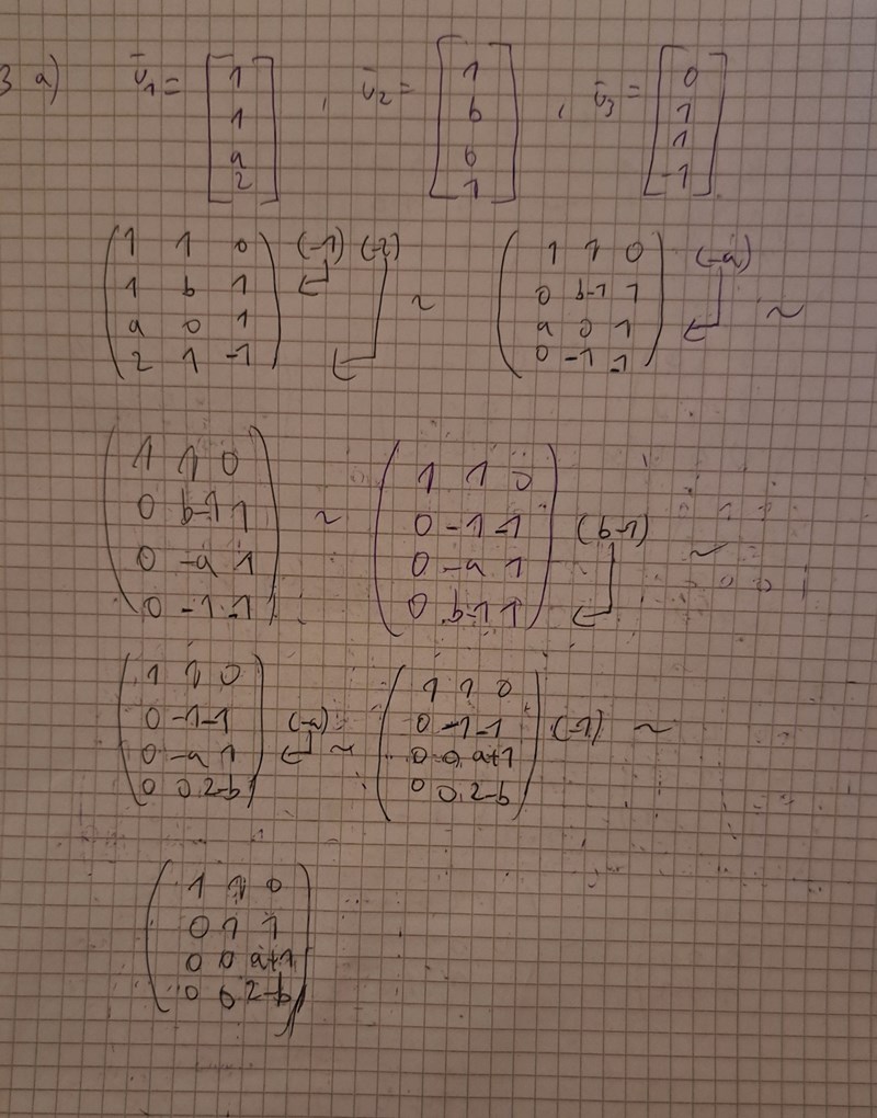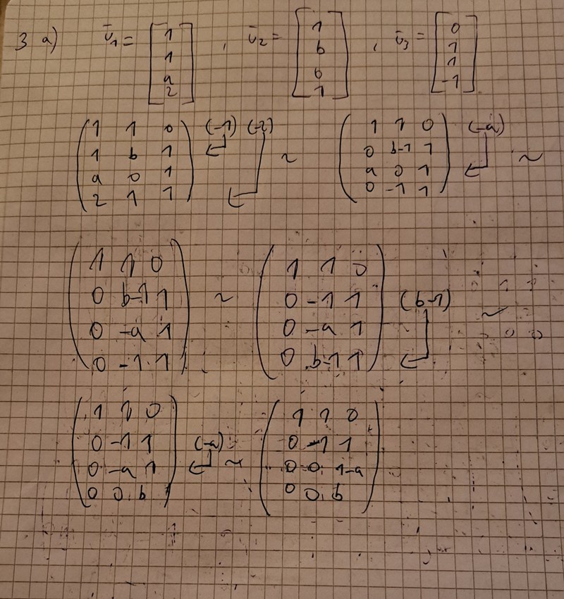 Ja juste nu fick jag 2-b och a+1 ovanför , typ såhär. Om b=2 och a=-1 får vi span (1,-1,1). Men vad innebär det egentligen? I R^4 kan man ha en , två ,tre eller 4 linjärt oberoende vektorer som spänner upp rummet.