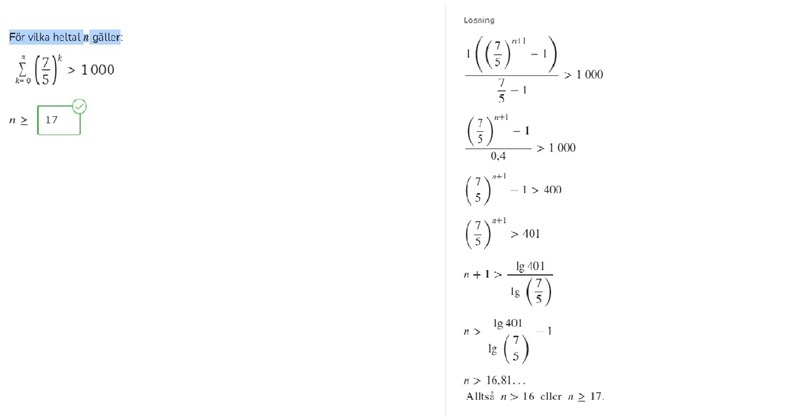 Jag löste den uppgiften och fick rätt svar men jag skrev  1((75)n-1)75-1>1000 och i facits svar är det lite annorlunda, varför i facit står det1((75)n+1-1)75-1? Jag menar att varför 7/5 ä upphöjt till n+1?