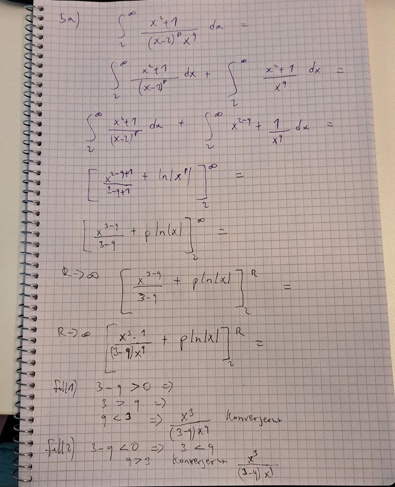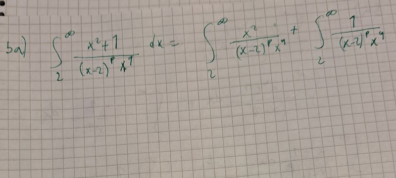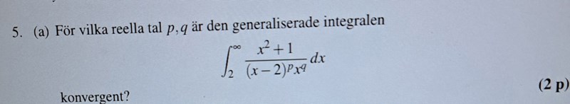 Jag vet att det finns en sats som säger att integralen konvergerar om och endast om p<1 och i detta fallet måste då både p och q <1 om integralen ska konvergera men hur jag ska ta mig an denna integral genom att beräkna vet jag inte. Är det meningen att man ska beräkna integralen eller mer argumentera ? Jag började med att visa att den andra integralen måste konvergera om q>3 eller q<3. Hur ska jag göra med den första integralen som involverar p vet jag inte.